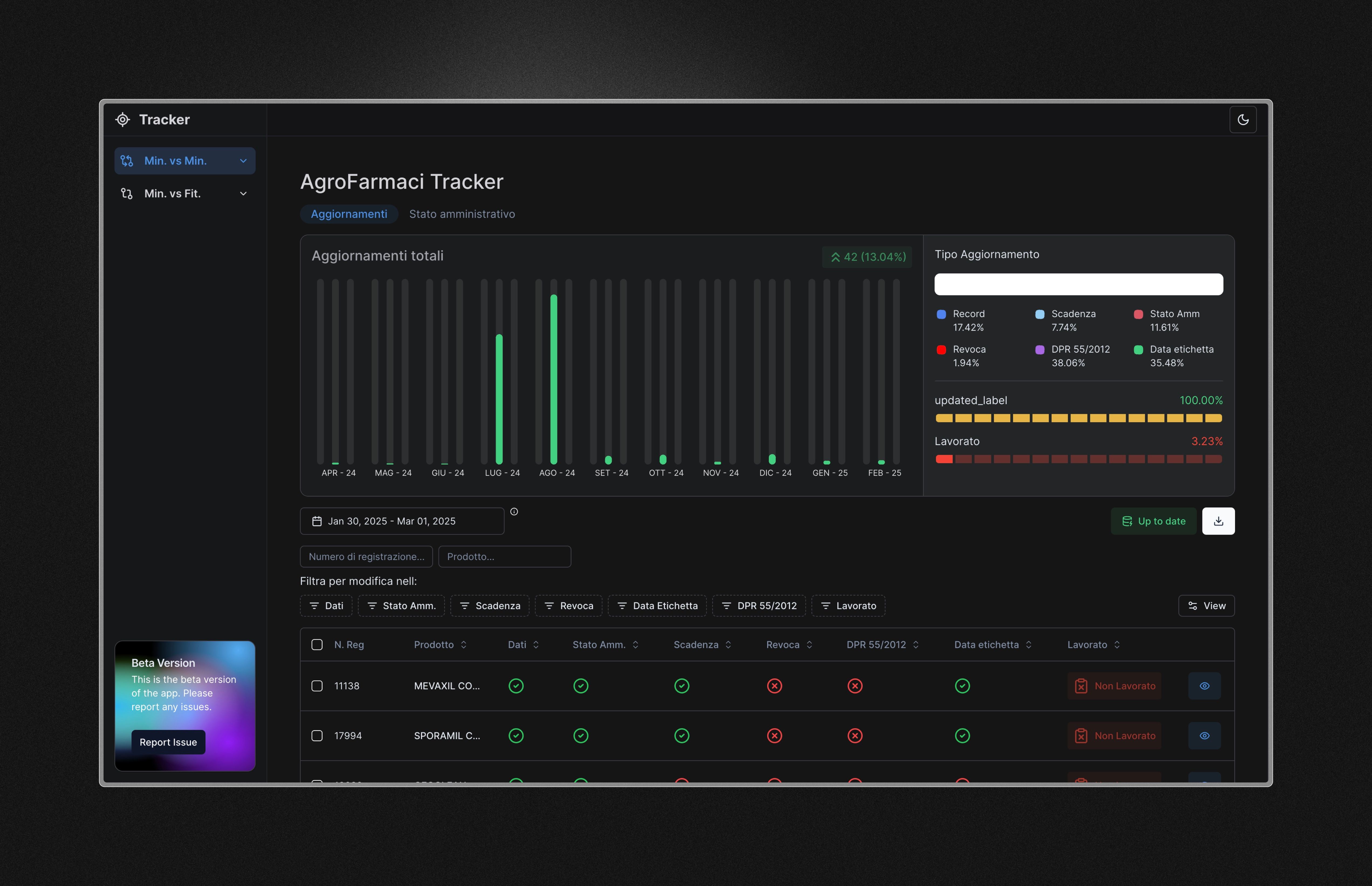 - O Tracker atua como o núcleo central de processamento de informações, registrando e gerenciando dados sobre produtos agroquímicos, regulamentações, classificações e atualizações técnicas.